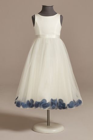Coordinate your flower girl's look with your bridal party! This satin and tulle flower girl dress features a bubble hem skirt filled with faux flower petals that complement your bridesmaids' color palette. The dress is finished with a matching satin sash. Mini magic! This style is available in infant and toddler sizes.