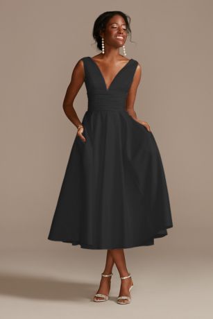 A clean and modern short wedding dress with a V-neckline, side pockets, and a twirly tea-length skirt, this chic style is perfect for courthouse weddings and other bride-to-be events.