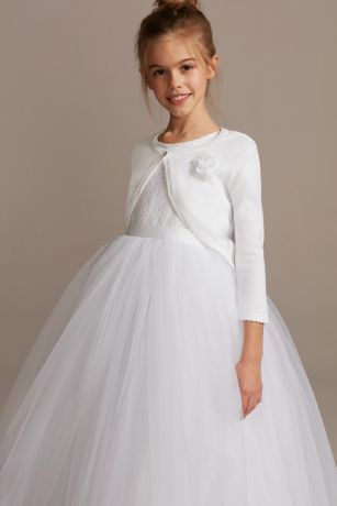 Sweet scallops trim the edges of this charming flower girl cardigan, featuring a single, crystal-embellished button at the collar. A removable flower detail completes the look.