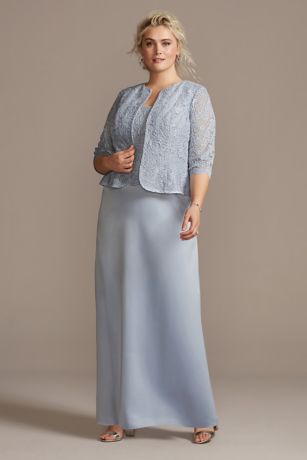 Classically elegant, this faux three-piece dress-and-jacket set features an open-front, glitter lace jacket finished with illusion 3/4 length sleeves. Paired with a matching scalloped lace bodice and sleek satin column skirt.
