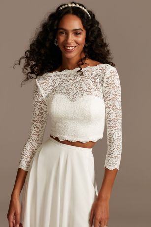 This lace three-quarter sleeve wedding separates top is trimmed with scalloped detail along the sleeves, boat neckline, and slightly cropped hem. An illusion sweetheart neckline completes this sweet and sophisticated piece. Designed to be mixed and matched with our wedding separate skirts.