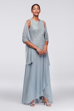 A breezy option for the mother of the bride or groom, this lace and mesh mock two-piece dress features a pretty scalloped bodice, a faux-wrap skirt, and a matching shawl for extra flair.