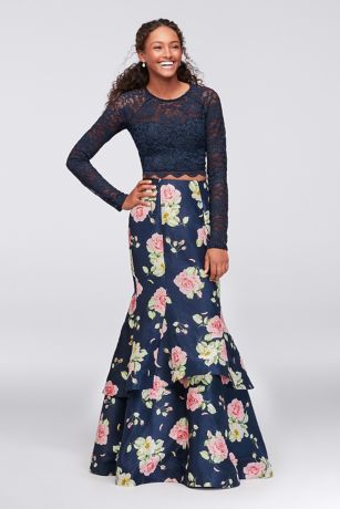 A sweet combo of scalloped lace and floral-printed silk shantung makes this long-sleeved, two-piece mermaid dress a hit for prom, while the keyhole back makes a cool style statement.