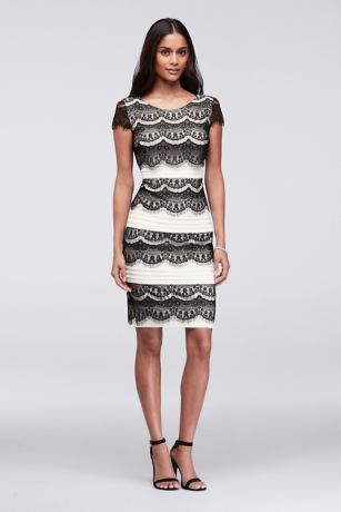 Cool contrast is created by romantic eyelash-lace scallops and bands of precisely pleated jersey on this cap-sleeve cocktail dress.