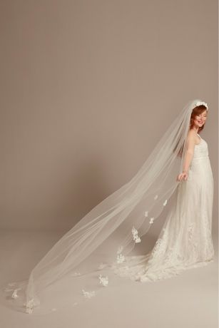 Placed lace appliques and beading embellish the scalloped edge of this long tulle veil.