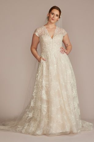 Scalloped lace trims the V-neck and cap sleeves of this wedding dress, exuding romantic opulence fit for a bride. It takes nearly 24 hours to place the lace and hand stitch 170 floral pieces onto the cascading skirt.