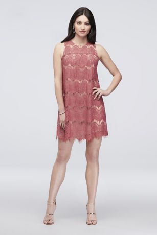 Rows of scalloped lace and dainty eyelash trim add feminine details to this short shift dress.