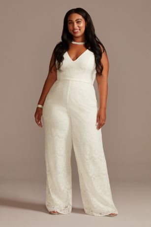 A beautiful alternative to a traditional white dress, this scalloped lace, wide-leg jump suit will flatter every figure. A plunging V-neckline, tank straps, and an attached lace belt add eye-catching detail.