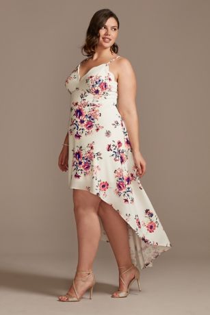 Turn heads in this scalloped spaghetti strap floral dress. The exaggerated high-low hem lends the perfect opportunity for showing off statement shoes.