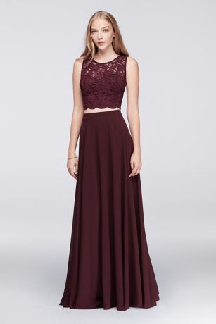 One of the hottest fashion trends, the crop top is a must-have for prom season. This two-piece dress features a glittery, scalloped lace crop top and a full, flowing skirt. This style is exclusive to David's Bridal.