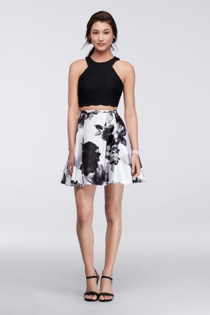 This homecoming look combines two of our favorite trends for a unique twist. The scalloped hem on the fitted crop top is the perfect match for the black and white watercolor floral skirt.