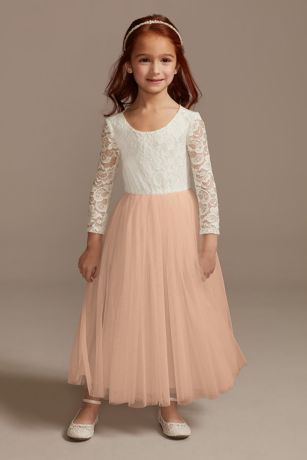 This long-sleeve A-line flower girl dress is crafted from a sweet lace-covered bodice with a soft flowy skirt. The lace V-back features a lovely scalloped detail. Mini magic! This style is available in infant and toddler sizes.