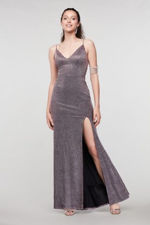 Channel your favorite celebrity in this glittery sheath with a sleek, slinky silhouette, skinny spaghetti straps, and a slit skirt. Now let's hit the red carpet!