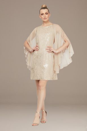 This dress is a recipe for a good time! The short and flirty silhouette, shimmery and shiny fabric, and a removable cape jacket are sure to make you feel more glam than ever.