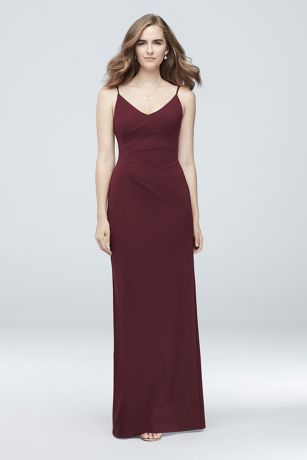 This slinky stretch crepe dress features adjustable spaghetti straps, a low scoopback, and side ruching. Complete with a back slit for easy movement on the dance floor.