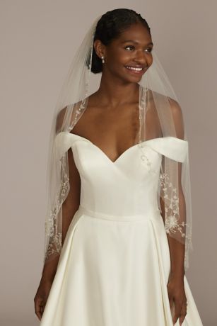 Delicate vines of beadwork grow around floral forms on this fingertip-length tulle veil.