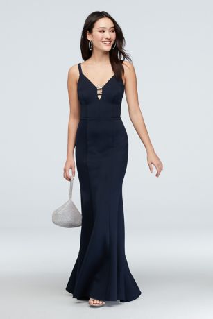 Scuba crepe fabric adds sleek dimension to an elegant mermaid silhouette, further defined with cascading ruffle at the back. Unique strap details, like an embellished notch and a strappy back, finish the look.