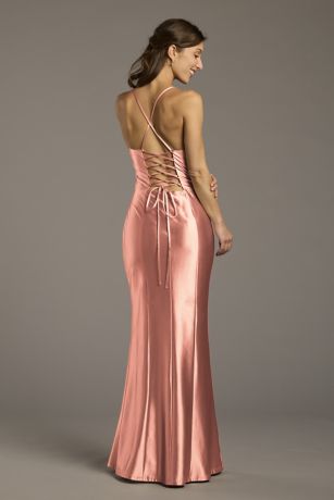 A sophisticated option for bridesmaids or partygoers, this sculpting satin sheath dress features a figure-flattering fit and a lace-up back. Rushing at the bodice and waist create the most flattering lines. Inner Beauty: The lace-up back is completely adjustable for all-day comfort.