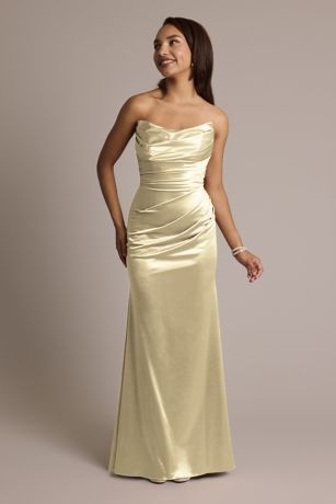 Flaunt your figure in our exquisite sculpting satin fabric, a blend of four-way stretch and high compression that does the work of shapewear. With a sculpted cat-eye neckline, sexy booty ruching, a mermaid silhouette, this strapless bridesmaid dress will make you look and feel incredible.