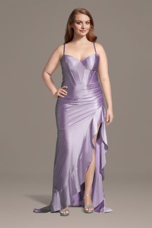 This sculpting satin sheath dress features a flattering V-neckline and structured corset bodice, finished with a chic ruffle skirt. A sleek, modern look designed to turn heads at prom or your next event.