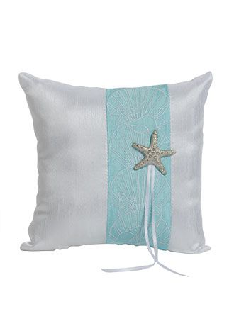 A band of embroidered seashells with starfish detail on a beautiful water-blue linen-look fabric, framed with a white linen-look satin make this ring pillow truly stunning. Top it off with a silver starfish and you have a breath taking addition to your wedding. Measures 8".