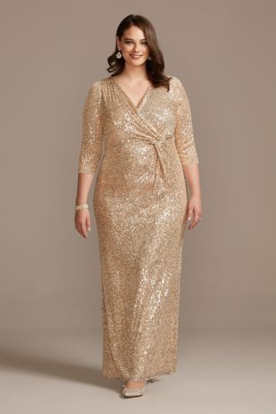 What a way to make an entrance! Turn heads in this light-catching sequin sheath dress with a curve-hugging wrap front that cascades into a complimentary twist detail.