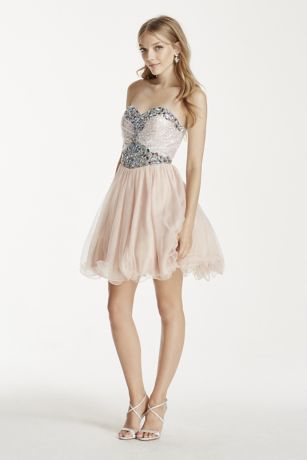 Channel your inner ballerina at this year's Homecoming in this ultra-glam crystal encrusted tulle dress! Strapless sweetheart soutach-detailed bodice is decked out with luminous crystal accents and sequins for some major sparkle and shine. Chic, tulle ballerina-style mini skirt gives this dreamy dress an ultra-feminine finish.