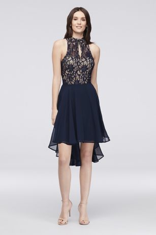 This pretty party dress features a lace-and-sequin bodice with a cutout back, and a flowy chiffon skirt with a high-low hem.