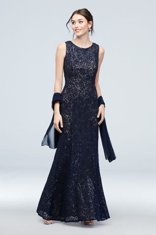 Choose this sleek lace dress, embroidered with sequins to highlight the lace's beautiful floral details and paired with a matching chiffon shawl, for an elegant look at any occasion.