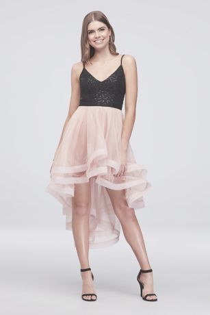 Horsehair trim and a high-low silhouette give this short dress a skirt that's perfect for twirling on the dance floor. The sequined bodice is sure to catch the light.