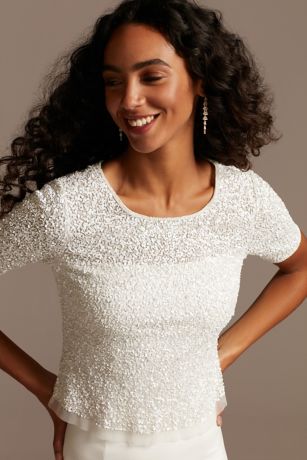 Like your favorite T-shirt all dressed up. This short-sleeve wedding separates top is covered in matte sequins and delicate beads, with a curved illusion mesh hem. Designed to be mixed and matched with our wedding separate skirts.
