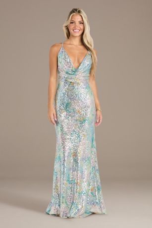 This eye-catching sheath dress features a stylish cowl neck and a stunning watercolor design, enhanced by shimmering sequins. The figure-hugging silhouette and wash of color make it an ideal choice for prom or any festive event.