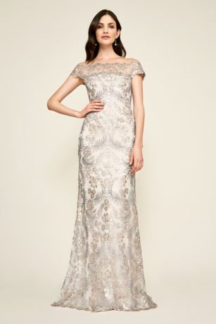 Sequin-adorned embroidery creates a shimmering floral motif atop this off-the-shoulder sheath dress. Finished with a pretty scalloped neckline and hem.