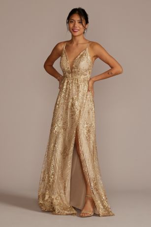 Gorgeous sequin embroidered fabric makes this plunge neckline bridesmaid dress a sexy standout.