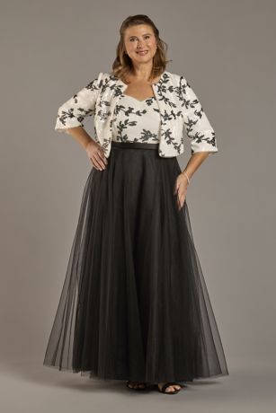 Shine with sophistication in this sequin bodice ball gown with a matching jacket that adds a touch of glamour and chic coverage. It's perfect for mothers of the bride or groom!