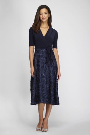 Take a spin on the dance floor in this flattering, fit-and-flare sequin lace party dress, topped with a surplice jersey bodice and a decorative waist tie.