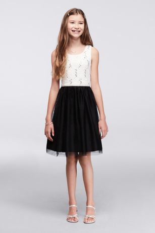A classic combo for young party-goers, this lace and tulle dress is sprinkled with sequins and finished with a sparkly rhinestone waistband.