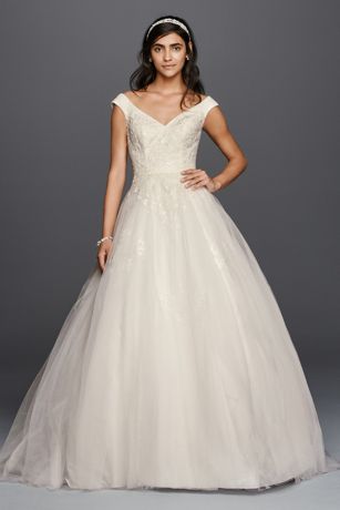 This classic ball gown wedding dress is one for the ages, thanks to the V-neckline and tank straps. The beaded lace bodice subtly catches the light while the skirt's lace appliques peek through a layer of tulle.