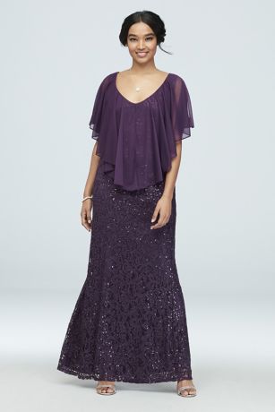 A sheer, handkerchief cut capelet, featuring a cold shoulder detail, sits atop this stretch sequin-lace mermaid plus-size gown.