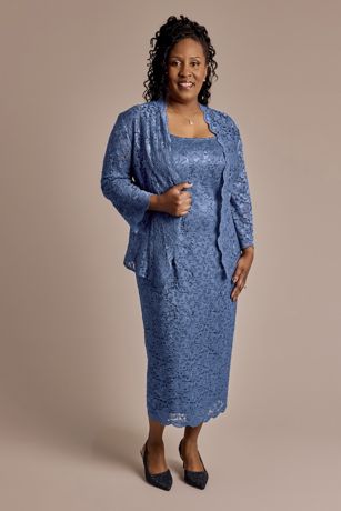 This sequin lace midi sheath dress is an elegant ensemble featuring sophisticated allover lace adorned with shimmering sequins and complemented by a tailored jacket with three-quarter sleeves.