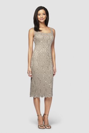 This lovely tea-length petite tank dress is crafted of sequin lace and features a flattering body-skimming fit. Complete with matching jacket.