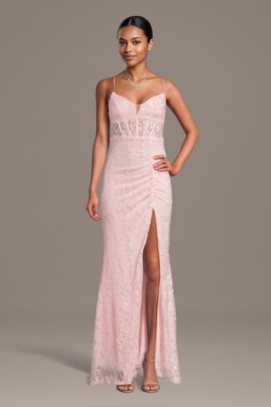 Sparkle from every angle in this sequin lace sheath, featuring delicate spaghetti straps and a flattering V-neckline. An illusion waist and side slit add drama, making it perfect for prom night.