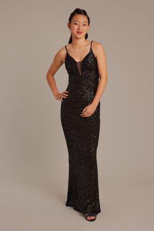 Go for it in head-to-toe sequins! This sparkly sheath looks hot, from the illusion plunge to the body-hugging silhouette.