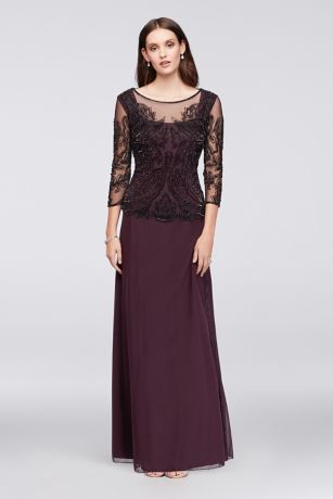 Intricate beading and sparkling sequins adorn the 3/4-sleeve illusion bodice of this flowing mesh dress.