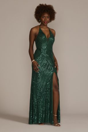 Lines of sparkling sequins add drama and dimension to this glamorous sheath dress, while the deep illusion V-neck and skirt slit make it sexy.