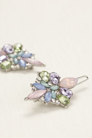 - These stunning hair clips feature multi colored pastel stones in a fun, geometric design.