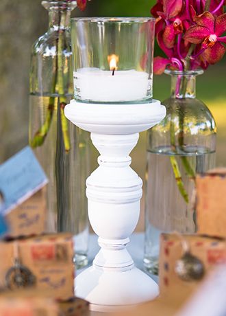 These shabby chic candle holders each feature a beautiful glass votive and come in a set of 3, with varied heights. Cluster all three together as an elegant centerpiece or space them out along the center of a long table with flowers and lanterns for an amazing shabby chic look.