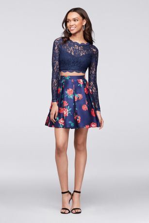Ready for every fall party, this scalloped glitter lace crop top is finished with illusion long sleeves, and pairs perfectly with a box-pleated, floral-print shantung skater skirt.