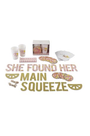 She found her main squeeze, and now it's time to celebrate! The She Found Her Main Squeeze 49 Piece Party Kit has all of the party and decor items that you need to host a truly unforgettable bachelorette party or bridal shower. The party pack includes 8 citrus design coasters, 24 polka dot straws, a "She found her main squeeze" banner, 8 "Pucker up & grab a cup" stadium cups and 8 "Love is SWEET" cookie bags, all featuring bright colors and a tropical theme.