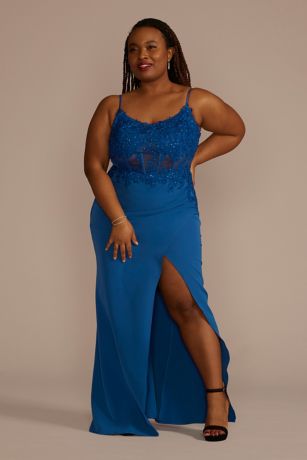 A sheer corset-inspired bodice detailed with intricate embroidery creates a sexy look on this sheath formal gown. Stretch crepe fabric gathers at the hip to reveal a dramatic skirt slit.